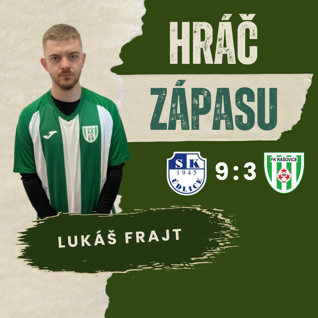Rašovický tým odehrál v sobotu utkání na hřišti Údlic, kde se od úvodních minut hrál velmi ofenzivní a na šance bohatý fotbal. Hned ve 3. minutě byli blízko vedení hosté, po dobré příležitosti nastřelil Lukáš Frajt pouze tyč. O dvě minuty později však udeřili domácí, kteří po rohovém kopu otevřeli skóre. Už v 8. minutě bylo vyrovnáno. Rašovice dostaly k dispozici nepřímý volný kop těsně před penaltovým puntíkem a přesnou střelou se prosadil David Knop. 1:1. Domácí si ale vzali vedení zpět ve 25. minutě, když hosté nedokázali odklidit míč z pokutového území a Cristiano Thomas poslal Údlice znovu do vedení. Ve 29. minutě zahrávali domácí penaltu po ruce rašovického obránce. Lukáš Kučera byl nekompromisní a zvýšil na 3:1. O chvíli později vybojoval v šestnáctce domácích míč Lukáš Frajt a snížil na 3:2. Závěr poločasu však patřil Údlicím, nejprve ve 43. minutě utekl obraně Lukáš Hoferica a upravil na 4:2, a těsně před přestávkou proměnil další pokutový kop Michal Hoferica. Do šaten se tak šlo za stavu 5:2.