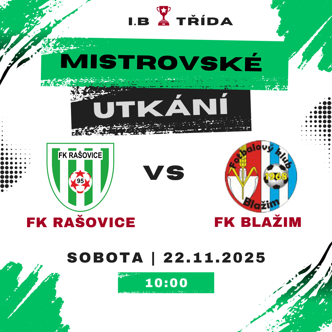 V sobotu čekal na Rašovice poslední zápas podzimní části sezony. Za mrazivého sobotního rána nastoupili na umělé trávě v Klášterci proti týmu Blažimi. Úvod utkání vyšel domácím velmi dobře, byli aktivní, důrazní a dobře se pohybovali. Už ve 12. minutě získaly Rašovice míč na půli hřiště, Martin Bašus našel Lukáše Frajta a jeho tečovaná střela prošla až za záda brankáře Blažimi. 1:0. Ve 25. minutě domácí navýšili vedení, když špatná rozehrávka hostujícího brankáře trefila přímo Martina Bašuse, který přesnou střelou zvýšil na 2:0. Ve 34. minutě však přišlo snížení. Odražený míč po odkopu Rašovických nešťastně poskočil ke hostujícímu Janu Weitzovi, který uklidil balon do branky. 2:1. Ve 40. minutě mohl vrátit dvougólové vedení Rašovicím Dominik Tancoš, který šel sám na brankáře, ale jeho pokus golman Blažimi zneškodnil. První poločas tak skončil těsným vedením domácích 2:1.